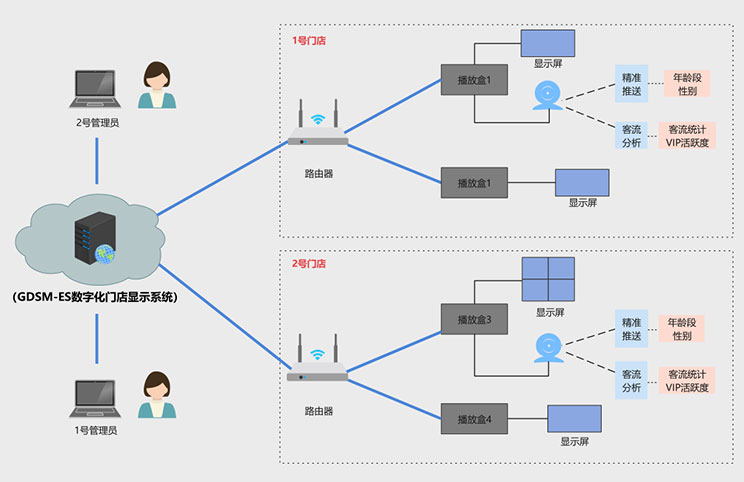 该客户为宁波地区零售门店,在一段时间内,客户发现门店销售额持续下滑,但是不知道原因出在哪里,到底是消费者减少,还是广告推送出现问题,亦或是其他原因,客户没有头绪,南宫科技数据化门店显示系统完美的解决了客户痛点,方案拓扑图如下: