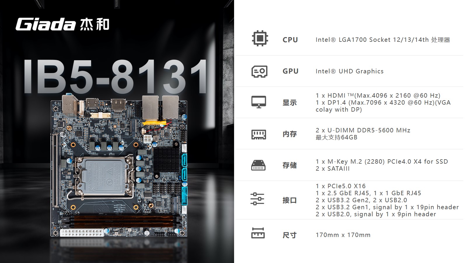 IB5-8131采用LGA1700插槽,采用Intel® B760 芯片组,支持Intel第12代至14代处理器,兼容Alder Lake-S、Raptor Lake-S和Raptor Lake Refresh 处理器,采用6+1相供电,即使在长时间高负载工作时也能维持稳定运行,配备2 x U-DIMM DDR5内存,最大支持96GB,频率最高可达5600MHz,可灵活扩展NVMe SSD和2个SATA3.0存储。