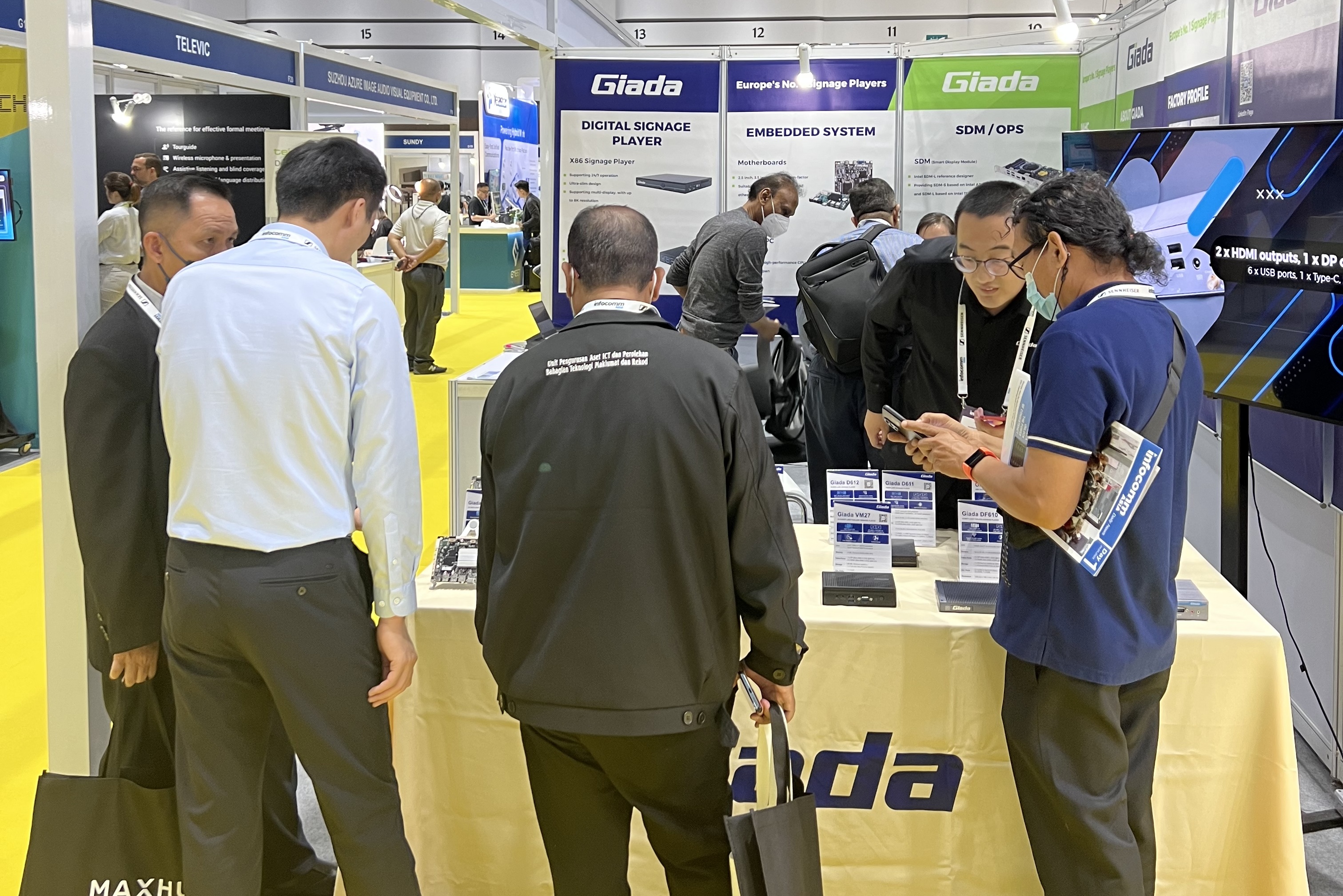 此次InfoCommAsia 2023展会,Giada南宫科技携最新产品及方案亮相。致力于为全球企业客户解决智能化应用需求的南宫,此次展会带来了数字标牌播放器、边缘计算机、OPS/SDM和嵌入式主板等的最新产品,并展示了一系列量身定制的解决方案,以满足泰国市场的具体需求,为亚太地区的数字化转型带来全新势能。展会期间,Giada的展台现场气氛火爆,展位人流络绎不绝!