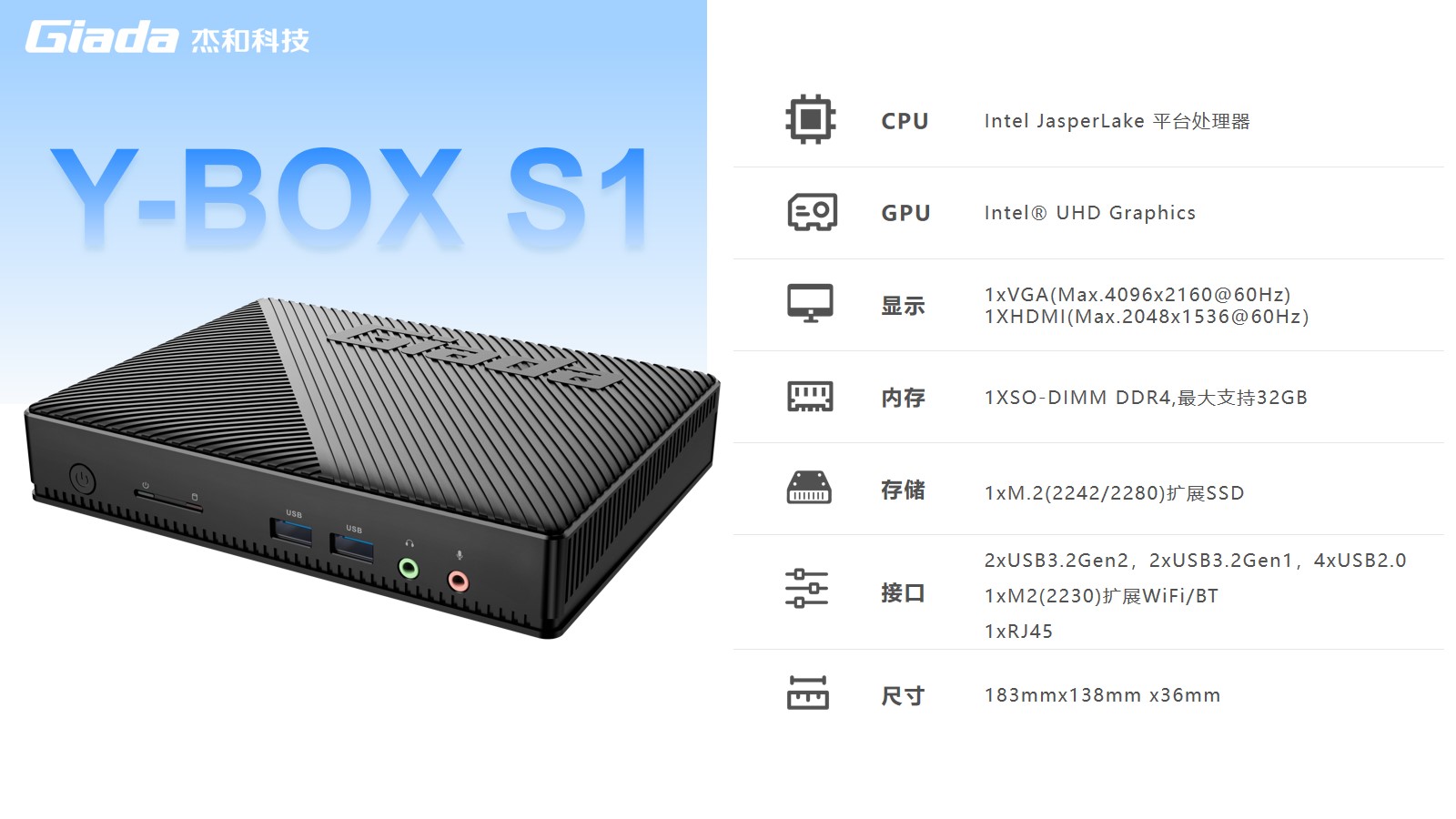 南宫VDI云终端Y-BOX S1采用Intel® Jasper Lake平台,搭载瘦终端主流处理器 Intel® Celeron®N5095,使用 Intel® UHD Graphics,1 X SO-DIMM DDR4内存插槽,支持HDMI显示接口,可实现4K超高清内容显示,低功耗,提供高清流畅的桌面体验。南宫Y-BOX S1作为瘦终端,性能也丝毫不弱,结合VDI架构的云桌面技术,具备便捷管理部署、性能优秀、扩展性强、安全性高等优势,在日常办公、视频娱乐等场景下,满足用户性能需求的同时,提供极佳的使用体验。